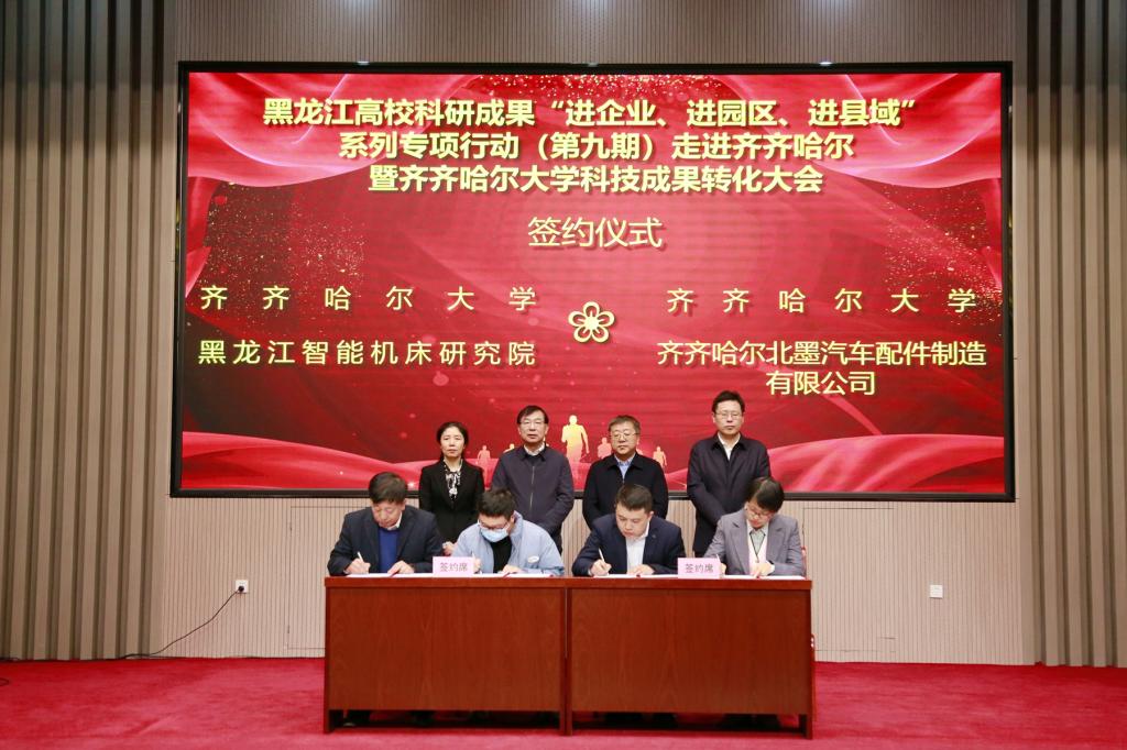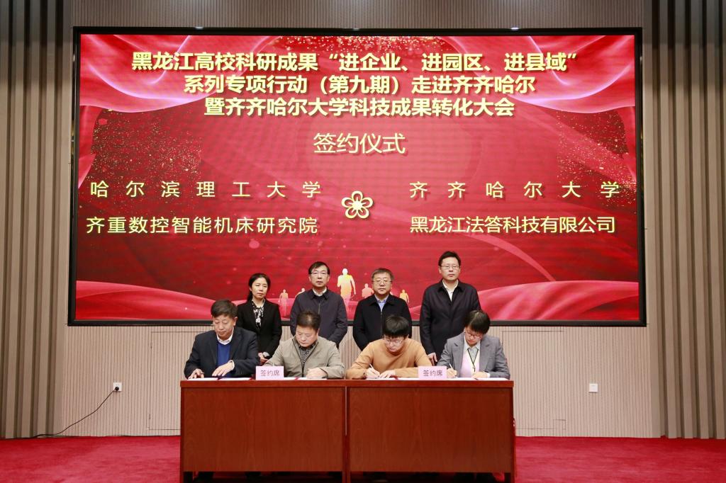 黑龙江省创业投资有限公司、益海嘉里(富裕)现代农业产业园、齐重数控装备有限公司、黑龙江智能机床研究院、齐齐哈尔龙江阜丰生物科技有限公司、黑龙江法答科技有限公司、威海华迈医疗器械科技有限公司和齐齐哈尔北墨汽车配件制造有限公司,分别与我校及市科学技术局、哈尔滨理工大学签署了合作协议。