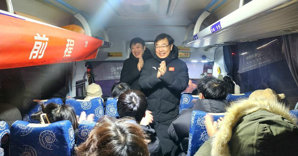 清晨6时30分,全部爱心送考车已在各个校区排列整齐,整装待发。校长郝文斌、党委副书记张文治早早来到现场,为考生们送上关怀与祝福。郝文斌与张文治登上送考车辆,与考生亲切交流,鼓励他们保持信心、沉着应考,并表达了希望他们在考试中取得优异成绩的美好祝愿。学校的温暖关怀冲淡了严冬的阵阵寒意,让考生们倍感温暖和鼓舞。大家一致表示,感谢学校的安排和老师们的鼓励,必将全力以赴,以最佳状态迎接考试。