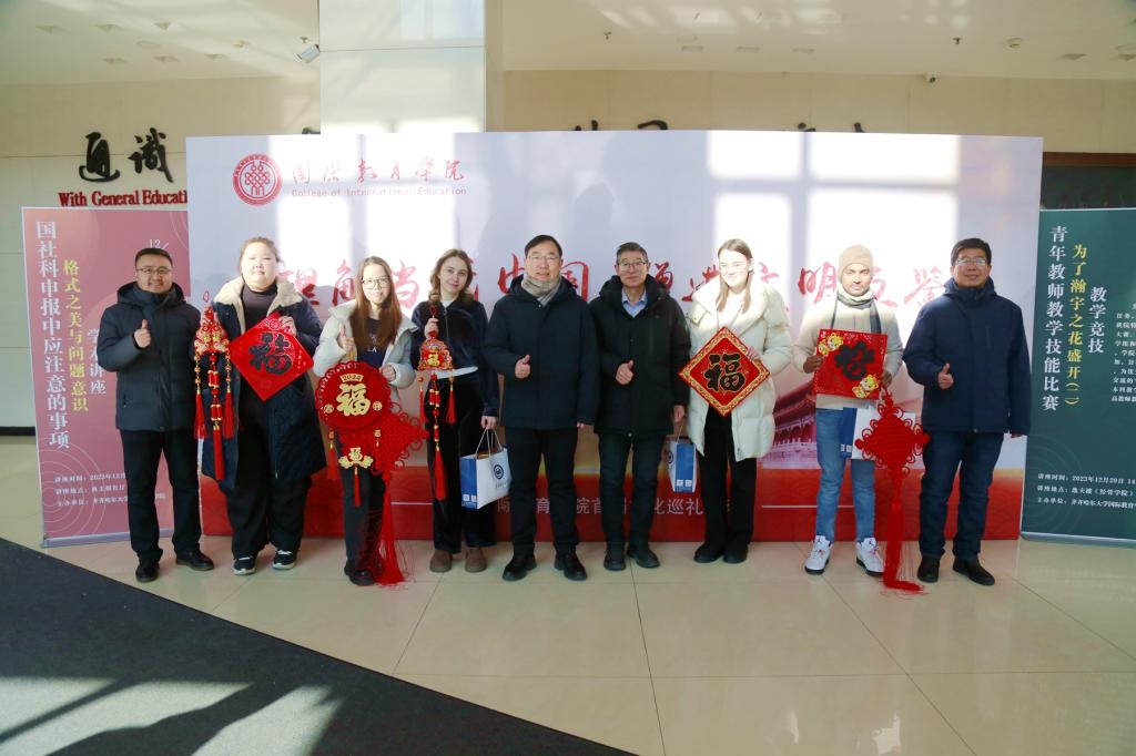 在德润大厦一楼大厅,郝文斌走进留学生中间为大家添喜送福,关切询问家庭状况,对留校的国际师生表达了节日的祝福和深切的问候,并为大家发放了新春大礼包。同时,他叮嘱同学们合理安排时间,注意假期安全,充分利用在龙江过龙年的宝贵契机,进一步感受中华优秀传统文化的魅力。希望同学们成为促进中外交流的桥梁纽带,为中外友好合作交流做出新的贡献。郝文斌表示,“每逢佳节倍思亲。”龙是中华民族的图腾,象征着奋进腾飞,吉祥如意。辞旧迎新之际,学校将更加关心关爱在校学生。祝大家龙行龘龘、前程朤朤、生活䲜䲜,在新的一年里扎根齐大沃土取得可喜成绩。