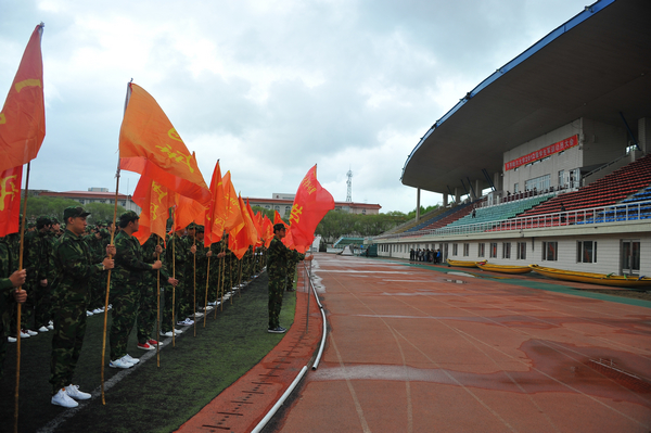 军训团迎“齐齐哈尔大学军训团团旗”,动员大会胜利闭幕。