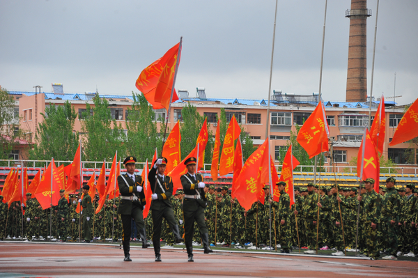 学校武装部政委、军训团副参谋长付建成整队向首长报告后,军训动员大会举行了隆重的升国旗、升校旗仪式。