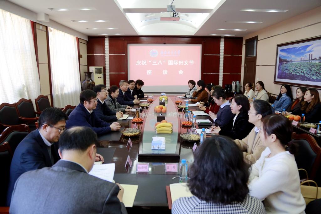 座谈会在轻松、愉快、融洽的氛围中进行。校长、校党委副书记郝文斌等校领导先后为女教职工代表献花。