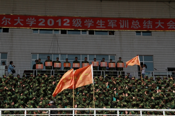 随着中国人民解放军进行曲的再次响起,我校2012级学生军训总结表彰大会圆满结束。总结表彰大会结束后,出席大会的校领导、军训团成员与参训部队首长、教官合影留念。