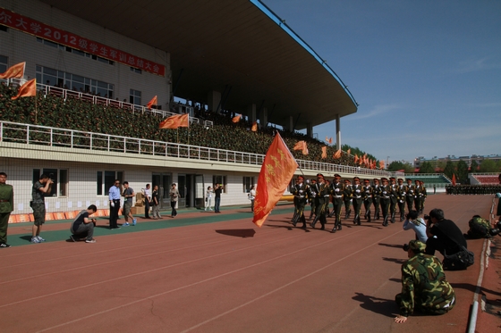 伴着雄壮的《解放军进行曲》,在军训教官的引领下,参加本次军训的2012级全体学生列成整齐威武的方阵,展示着飒爽的英姿。