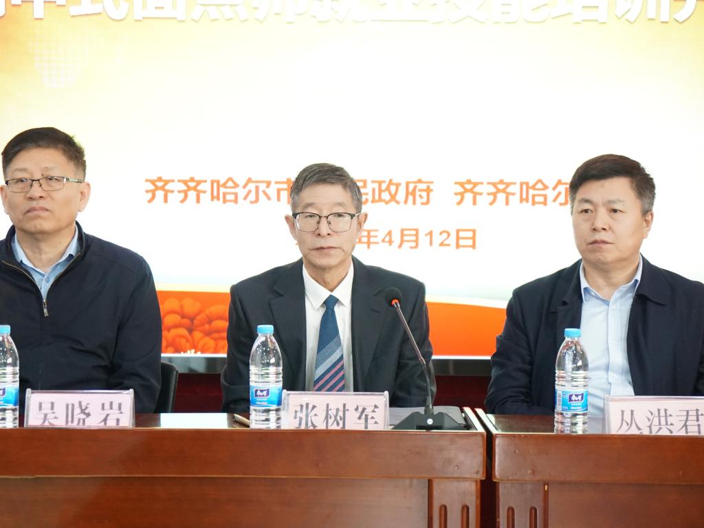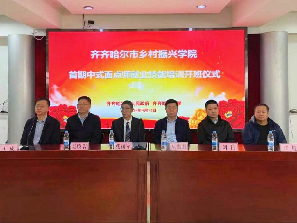 为深入贯彻落实习近平总书记关于实施乡村振兴战略重要讲话重要指示精神和党的二十大关于全面推进乡村振兴战略重大决策部署,加快推进实用技能人才培养,4月12日上午,齐齐哈尔市乡村振兴学院首期“中式面点师”就业技能培训开班仪式在我校培训中心4楼会议室顺利举行。学校副校长、党委常委张树军,齐齐哈尔市人力资源和社会保障局局长丛洪君出席,齐齐哈尔市以及学校相关部门负责人参加,仪式由继续教育学院院长王成主持。