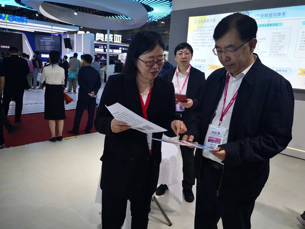 校长郝文斌及学校相关部门负责人,主要考察学习了“高校专区”和“高新装备展区”及“特色专区”,并围绕“AI+教育 全面发展高校新质生产力”“智慧教育”“高校探索数字化转型”等主题,与参展高校及高新装备企业负责人进行深入交流。