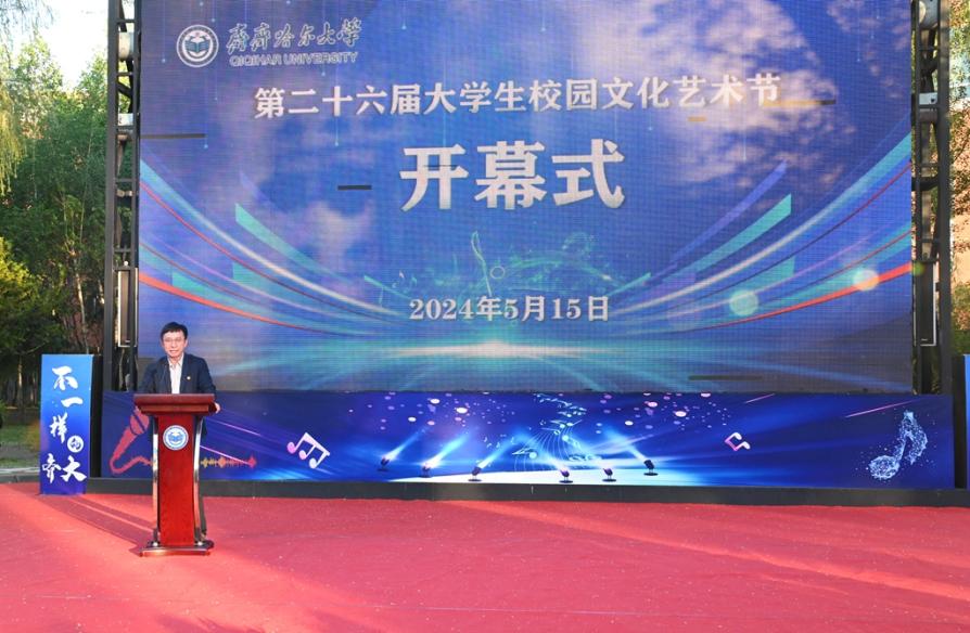 开幕式上,学生工作部(学生处)部(处)长杜海权宣读了《齐齐哈尔大学第二十六届大学生校园文化艺术节实施方案》;第七届大学生艺术展演省级一等奖获奖者、音乐与舞蹈学院秦依琳同学作为学生代表发言。
