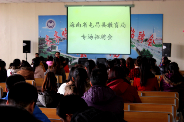 海南省屯昌县教育局领导携屯昌中学、屯昌县思源高级中学负责人在我校学生指导中心举办专场人才招聘会,就我校2013届师范类9个专业毕业生进行集中选聘。通过笔试、面试、试讲等考察环节,我校2013届8名应届毕业生与海南省屯昌县教育局用人单位成功签约。学生指导中心主任杨国志表示,随着每年大学生毕业生就业求职人数的不断增加,招聘单位和求职毕业生的需求多样化、个性化。为此,我校坚持长期举办类型多样的小型招聘会,坚持常年为毕业生求职和用人单位举办小型专场招聘会。实践证明,这样具有针对性的小型专场招聘会,更富有针对性、实效性。
