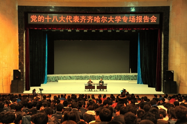 4月3日下午,党的十八大代表齐齐哈尔大学专场报告会在我校文化宫举行。十八大代表、甘南县兴十四村党总支副书记王淑媛做专场报告,来自齐齐哈尔大学、齐齐哈尔医学院、齐齐哈尔工程学院、齐齐哈尔高等师范专科学校、齐齐哈尔交通职业技术学院的1200多名大学生共同聆听报告。我校党委副书记盖元臣主持了报告会。