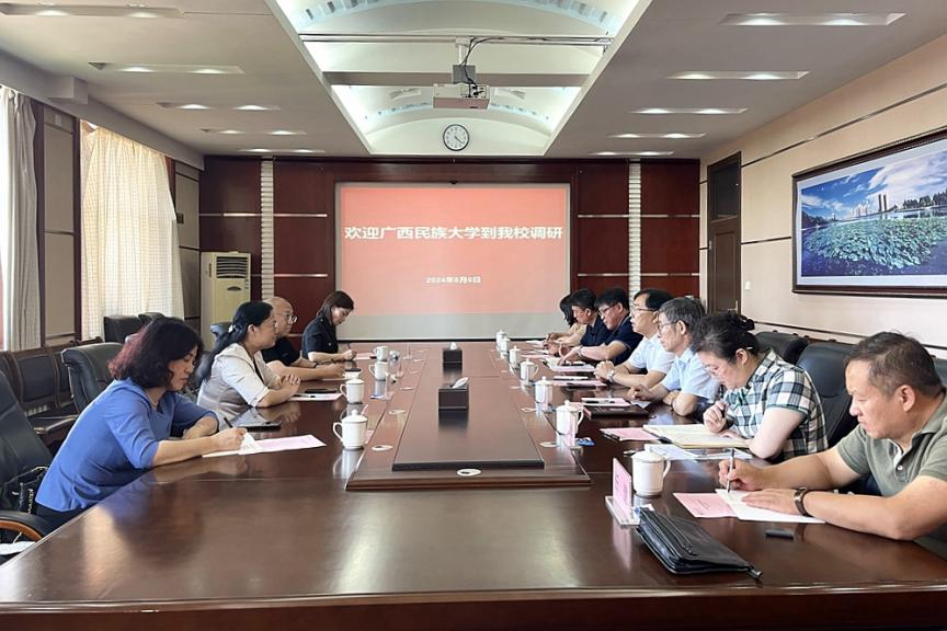 8月6日下午,广西民族大学校长韦仕珍、副校长姜明国等一行4人来到我校调研交流。学校在办公楼504会议室召开座谈会,校长郝文斌、副校长张树军会见了韦仕珍一行。