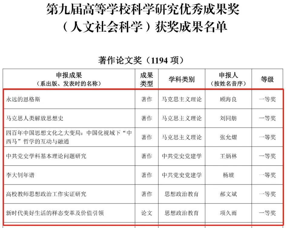据悉,本次评选马克思主义理论学科共有7位学者获一等奖,分别为北大顾海良教授、浙大刘同舫教授、上海师大张允熠教授、北师大王炳林教授、北大杨琥副研究员、齐齐哈尔大学郝文斌教授、武大项久雨教授。高等学校科学研究优秀成果奖(人文社会科学)是我国高校哲学社会科学领域最高级别的政府奖项,旨在表彰高校哲学社会科学工作者取得的突出成绩,展示高校社科界服务党和国家事业发展的重大理论与实践成果,推动高校加快构建中国特色哲学社会科学。
