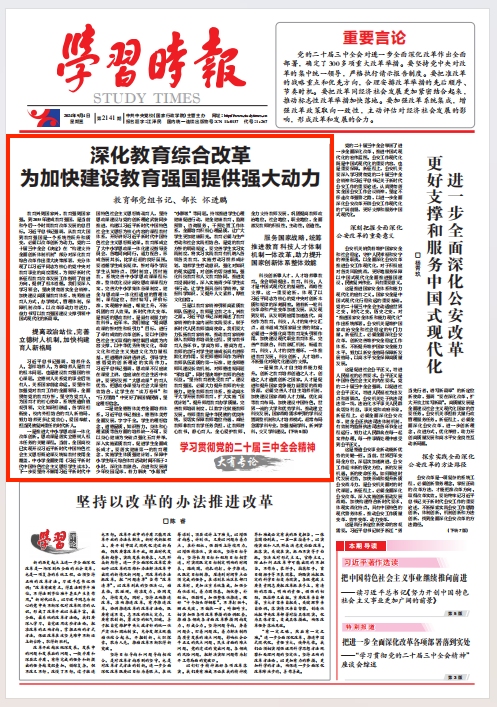 全面深化教育改革,加快建设教育强国,使命光荣、责任重大。教育系统将更加紧密地团结在以习近平同志为核心的党中央周围,坚持以习近平新时代中国特色社会主义思想为指导,认真学习贯彻党的二十大和二十届二中、三中全会精神,深刻领悟“两个确立”的决定性意义,增强“四个意识”、坚定“四个自信”、做到“两个维护”,当好贯彻党中央决策部署的执行者、行动派、实干家,为以中国式现代化全面推进强国建设、民族复兴伟业作出新的更大贡献。