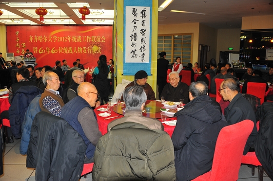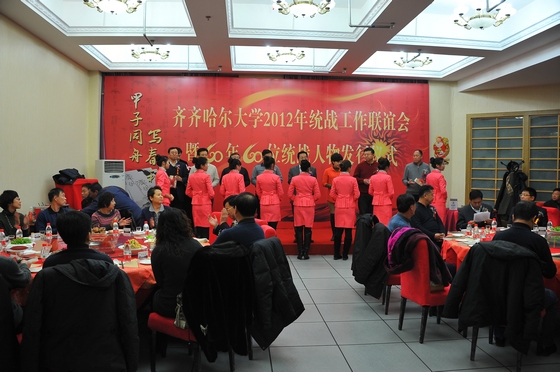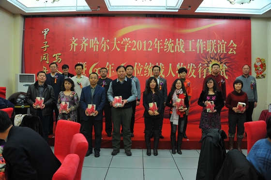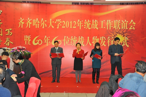 风雨送春归,飞雪迎春到。12月21日晚,北国明珠劳动湖畔灯光璀璨、霓虹辉映,美丽的环湖大学沉浸在新春瑞雪的祥和气氛中。我校德润大厦宴会厅内高朋满座,群贤毕集。齐齐哈尔大学2012年统战工作联谊会暨《60年60位统战人物》发行仪式在热情欢快的迎宾曲中拉开帷幕。