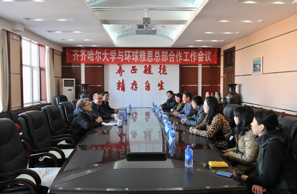 1月8日下午,环球雅思总裁张永琪先生在雅思齐齐哈尔培训学校校长杜云霞、副校长常思的陪同下访问我校,我校副校长吕晓辉会见了客人,并在中主504会议室,举行了齐齐哈尔大学与环球雅思总部工作会议。外事处处长胥军、副处长谢晓丰、周丽,外国语学院院长张坤,大学英语教研部主任马冬、副主任张丽丽会见时在座。