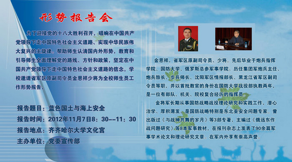 形势报告。十八大前后,我校举办全校范围的形势报告会。十八大召开前的11月7日,学校邀请省委党校特聘专家、省军区原副司令员金恩祥少将为全校师生作题为《蓝色国土与海上安全》形势任务报告;十八大后,学校拟邀请市委宣讲团副团长、市委党校经济学教授何莉为全校师生做党的十八大精神专题辅导报告;同时还将邀请省、市其他有关领导、专家、党的十八大代表和校领导为全校师生做形势政策报告。