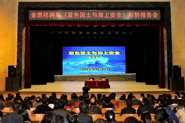 为了迎接党的十八大胜利召开,唱响在中国共产党领导下走中国特色社会主义道路、实现中华民族伟大复兴的主旋律,帮助师生认清国内外形势,坚定在中国共产党领导下走中国特色社会主义道路的信念,按照省委高校工委和省教育厅党组的安排和部署,齐齐哈尔大学牵头负责齐齐哈尔地区高校的形势报告会。11月7日上午,特邀原黑龙江省军区副司令员金恩祥少将,为齐齐哈尔地区高校师生代表作了《蓝色国土与海上安全》的精彩生动的形势报告。报告会在齐齐哈尔大学文化宫举行。