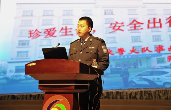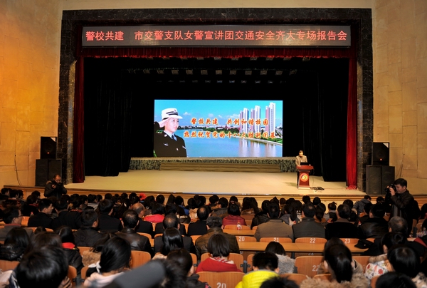 为进一步提高全校师生的交通安全意识,打造安全有序的交通环境,按照我校《关于做好党的十八大安保攻坚战暨2012“119”消防安全活动月实施方案》的日程安排,11月14日下午16时,齐齐哈尔市交警支队女子宣讲团受学校的邀请,在中区文化宫为全校师生做了交通安全知识专场报告会。出席报告会的领导有校党委副书记盖元臣同志、齐齐哈尔市公安局党委委员副局长张学柱同志、齐齐哈尔市公安局党委委员交警支队支队长孙菠及交警支队班子成员,校相关部门领导、教师代表及学生代表近1500人,报告会由保卫处处长邵丙军同志主持。