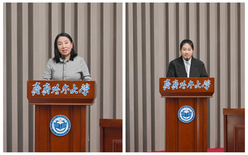 外国语学院英语专业张丽云教授与学生李艳明分别代表评委和参赛选手进行表态发言。