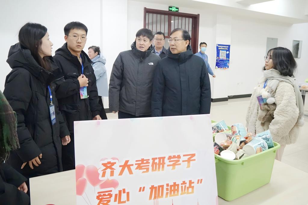 郝文斌代表学校向考研学生表示关怀和慰问,对学生备考过程中所表现出齐大人拼搏进取、昂扬向上的精神表示肯定和赞扬。他细致询问了同学们的院校报考、学习状态和生活状况,勉励考研学子“路虽远行则将至,事虽难做则必成”要注意劳逸结合、科学调整复习策略,乐观积极迎接大考,并预祝同学们金榜题名,一战成“硕”。在走访慰问过程中,郝文斌还仔细查看了考研自习室的学习环境和条件保障,他强调各部门要多措并举、全员联动、凝聚合力,积极创造条件为考研学生提供全面、优质的服务和保障,积极教育引导好考研学生以理性平和心态迎接“大考”。