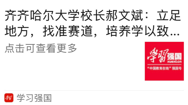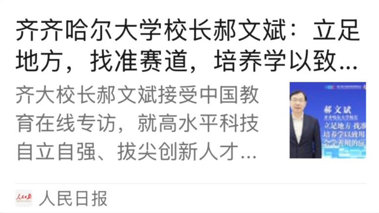 郝文斌:我觉得这是一个非常好的问题,也是对高校的一个现实考验。之前也有过“钱学森之问”,如何把创新人才培养和国家重大战略、未来发展有机结合?对于创新人才的培养,我认为,首先要厘清“创新人才”的内涵。我们国家有3000多所高校,不同类型、不同层次的高校,其办学定位和目标任务是不同的。齐齐哈尔大学,属于应用型大学,我们要找准我们的赛道,应用型大学和北大、清华等研究型大学建设世界一流大学的赛道是不一样的。