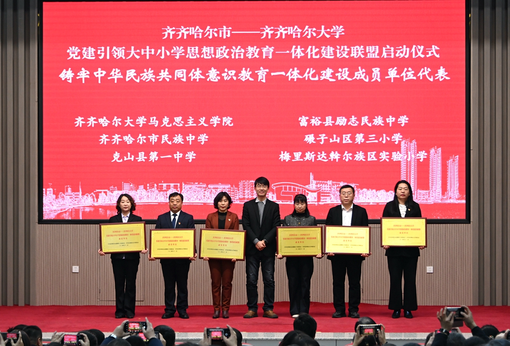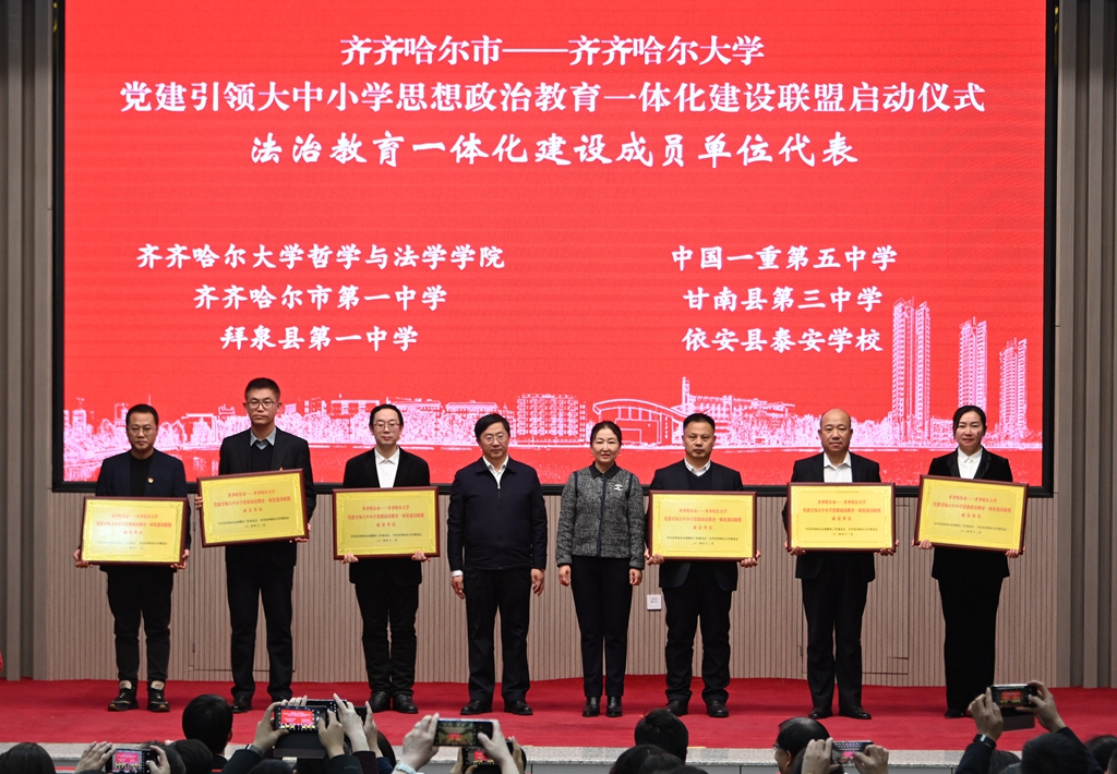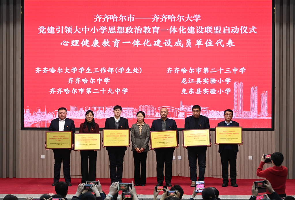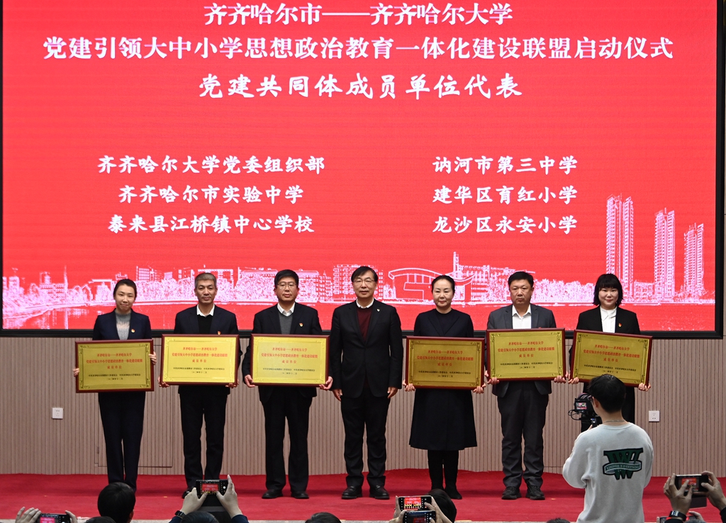 与会领导分别为“齐齐哈尔市—齐齐哈尔大学党建引领大中小学思想政治教育一体化建设联盟”成员单位代表授牌。