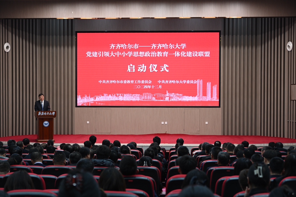 12月10日下午,齐齐哈尔市—齐齐哈尔大学党建引领大中小学思想政治教育一体化建设联盟启动仪式在日新大厦四楼报告厅举行。齐齐哈尔市委副书记、市委教育工委书记刘振江,齐齐哈尔市副市长高淑春,我校党委书记丁宏,校长、党委副书记郝文斌,党委副书记齐宏伟,黑龙江省民宗委文化宣传教育处处长吴鹏,齐齐哈尔市教育局局长、市委教育工委副书记姜林出席仪式。仪式由校党委副书记张文治主持。
