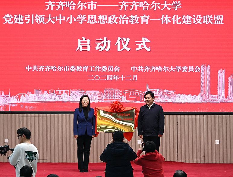 刘振江和丁宏一起为“齐齐哈尔市-齐齐哈尔大学党建引领大中小学思想政治教育一体化建设联盟”揭牌。