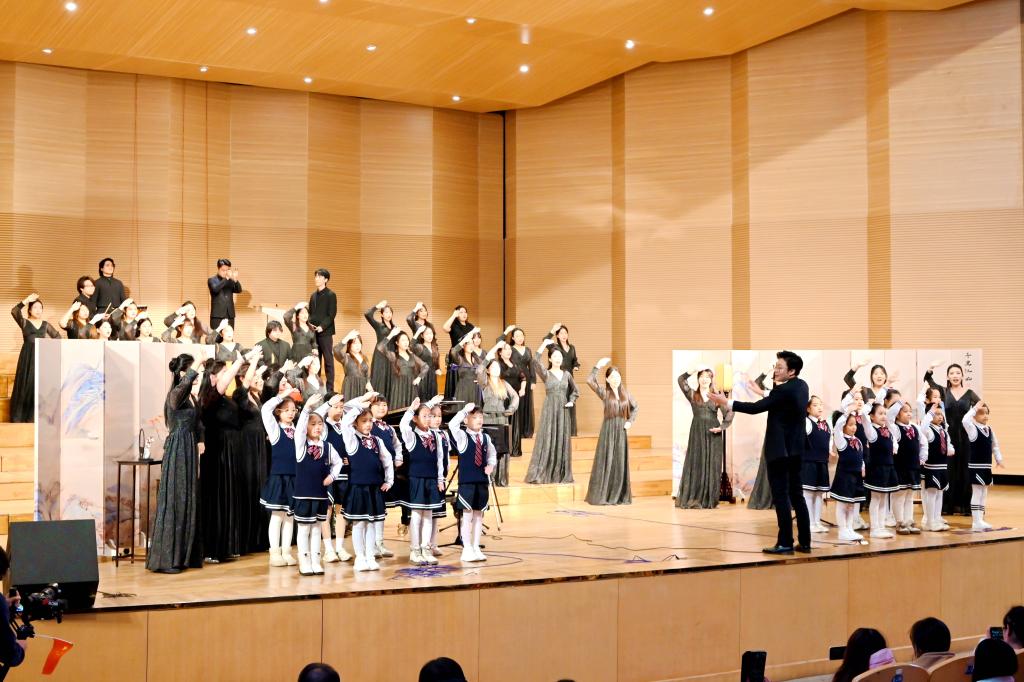 音乐会在中国古代文学源头《诗经》中《小雅·鹿鸣》的合唱声中拉开帷幕,齐大合唱团和育红小学童声合唱团配合默契,相得益彰,空灵清澈的歌声和礼仪表演,尽显西周礼乐文化的古朴典雅,这也是学校大中小学思想政治一体化建设的成果展示。