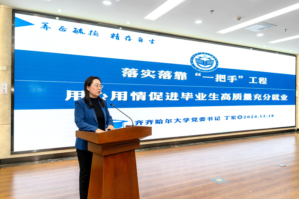 丁宏以《落实落靠“一把手”工程 用心用情促进毕业生高质量充分就业》为主题,分别从强化组织领导,健全机制聚合力、强化模式创新,联动改革提质量、强化市场开拓,访企拓岗增供给三个方面介绍我校就业工作经验。她谈到,学校定期召开招生就业一体化工作会议,坚持招生、培养、就业工作一体推进。将就业率作为专业设置、招生计划的重要指标,凡是毕业生就业率不高的专业必减计划。实施“四创”工程,依托省政府“环齐齐哈尔大学创新创业生态圈”重点建设项目,新建以大学生创新实验室、创意展馆、创业服务站、创造工厂为主体的大学生创业园,促进毕业生服务龙江和成果落地转化。扎实开展就业基地建设,学校建有理工类、艺体类、师范类实习基地508个,80%为龙江企业和事业单位,有力引导毕业生基层就业、留省就业。另外,学校在办学经费十分紧张的情况下,全力支持“访企拓岗促就业”,制定专项方案,校领导亲自带队对接、走访用人单位。2024年,学校走访用人单位1564家次,新增就业岗位8000余个,新增就业基地137个,做到访企拓岗必须带回“新单位、新岗位”。