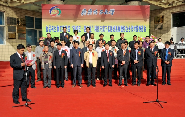 9月21日,在我校60周年校庆之际,由齐齐哈尔市科技局、齐齐哈尔大学科技处、食品与生物工程学院联合主办,由博天糖业依安分公司、齐齐哈尔强能酒业制造有限公司、齐齐哈尔圣和源食品有限责任公司等17家企业协办的“迎校庆,惠民生”科技专家下基层成果展暨校企合作对接会启动仪式在我校西二区教学楼前隆重举行。省科技厅人事处处长熊百良,副处长王晓群,市科技局党委书记王建良、市科技局局长吴焕军、组织部部务委员吴兵、我校校长马立群、常务副校长郑喜群、副校长邓启刚,科技处处长郑永杰、食品与生物工程学院党委书记杨淳、院长裴世春、我校科技专家代表材料科学与工程学院院长刘喜军、机电工程学院常务副院长王世刚、食品与生物工程学院副书记、副院长赵振华、副院长刘晓兰、任健、17家齐齐哈尔市企业代表、食品学院全体教师及学生600余人参加了参加了“迎校庆·惠民生”科技人才下基层成果展暨校企合作对接推进会。