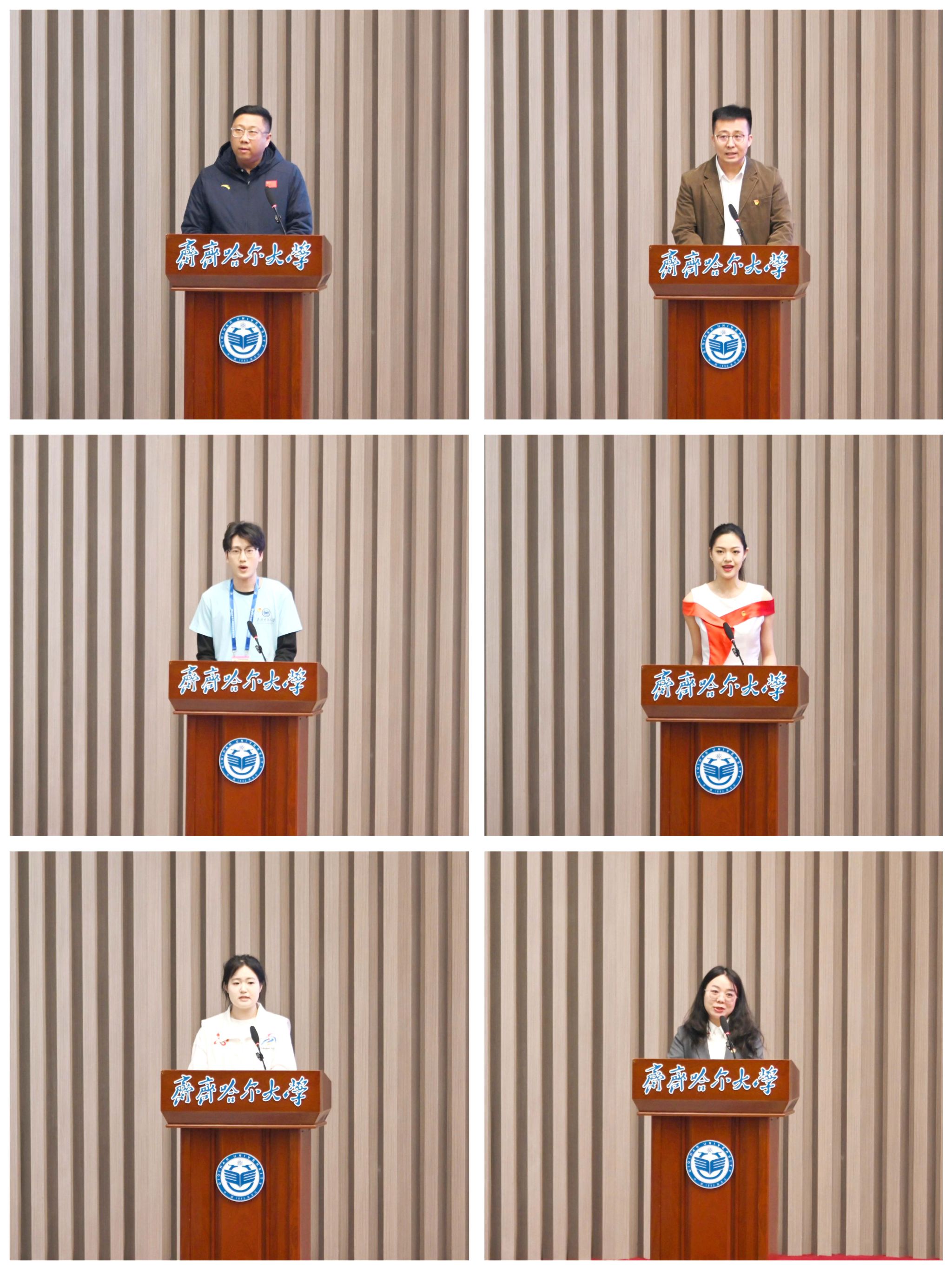 本次活动是齐齐哈尔市-齐齐哈尔大学党建引领大中小学思想政治教育一体化建设的又一具体行动和创新举措,旨在深入学习贯彻习近平总书记关于教育的重要论述和习近平总书记出席第九届亚冬会期间作出的重要指示精神,聚焦新时代立德树人工程,挖掘冰雪文化中的思政元素,上好“行走的龙江思政课”。活动共分三个篇章,在第一篇章“榜样引领——师生接力讲述亚冬故事”中,亚冬会裁判郭晗、舞蹈志愿服务领队许传东、马克思主义学院思政课教师雷荣珍、舞蹈志愿服务者陈宇凡、开闭幕式引导礼仪志愿服务者李京珊、“城市侧”志愿服务者马硕接力深情讲述亚冬会齐大志愿服务故事。