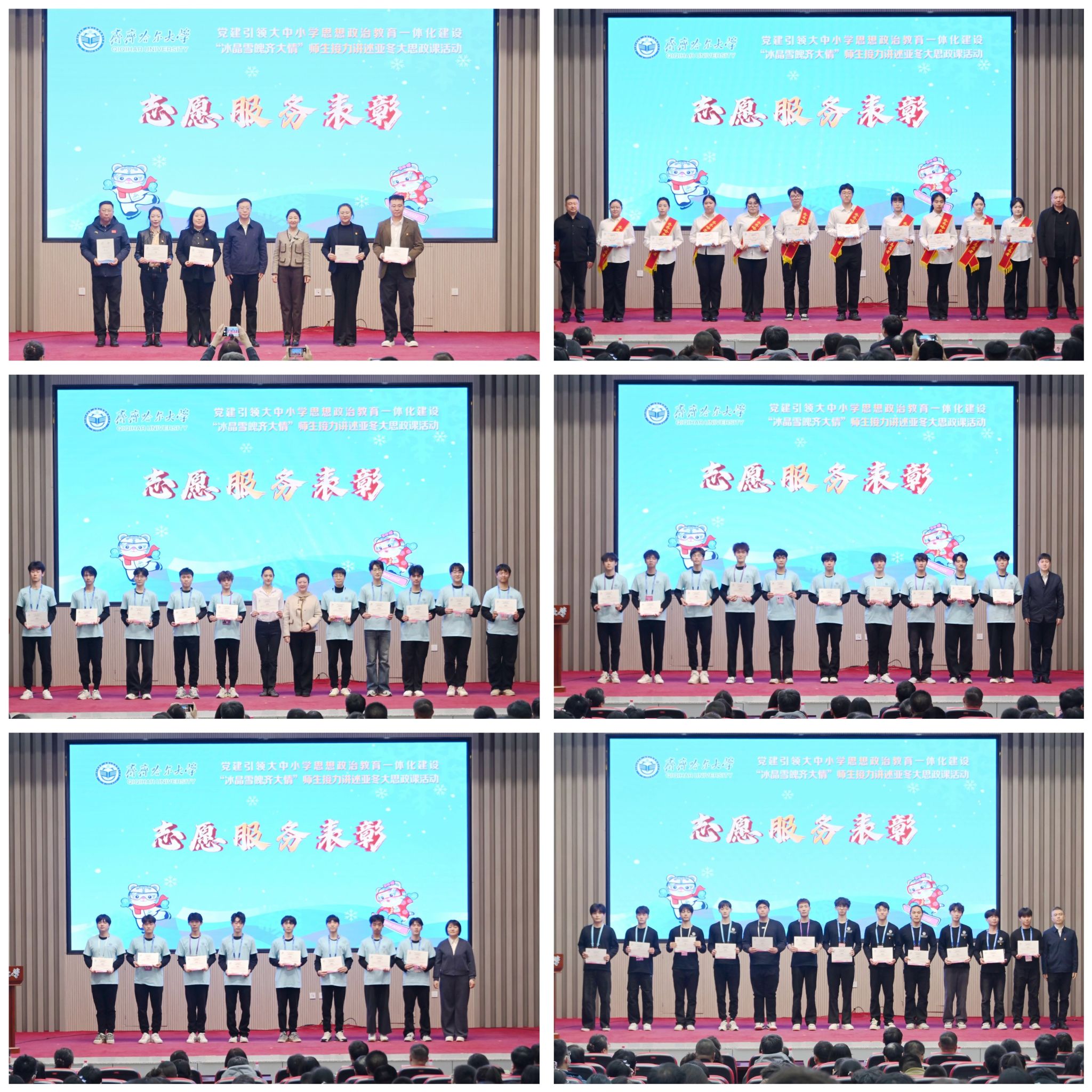 与会领导为亚冬会志愿服务先进个人颁发了表彰纪念证书,全场师生共唱《歌唱祖国》,表达“身在最北方 心向党中央”的政治忠诚。