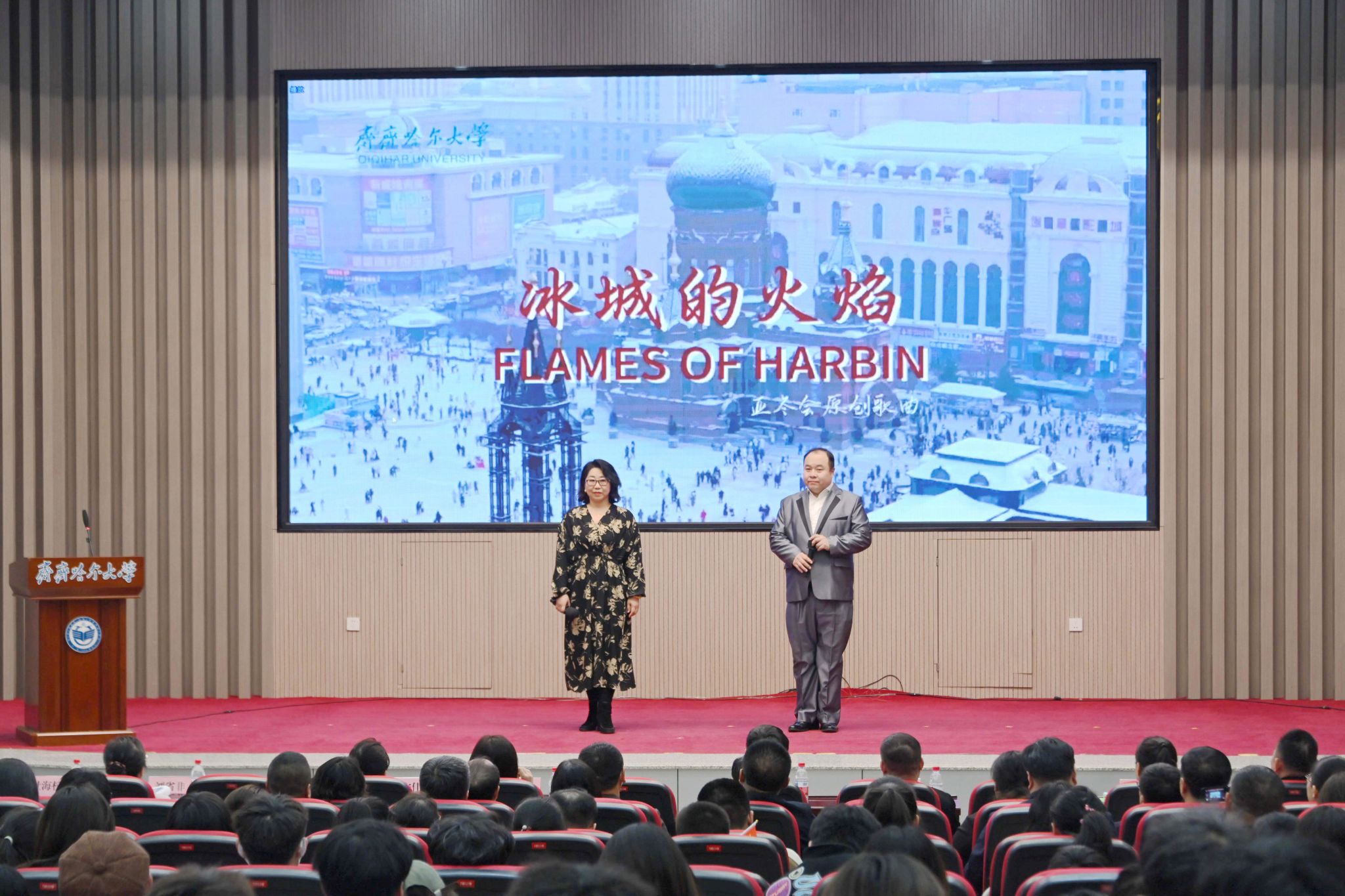 在第三篇章“文化推广——多维呈现亚冬成果”中,我校青年党的创新理论宣讲团带来诗朗诵《冰晶雪魄齐大情》。音乐与舞蹈学院教师现场带来“齐大迎亚冬”原创歌曲《冰城的火焰》,将齐大正能量和好声音传播开来。