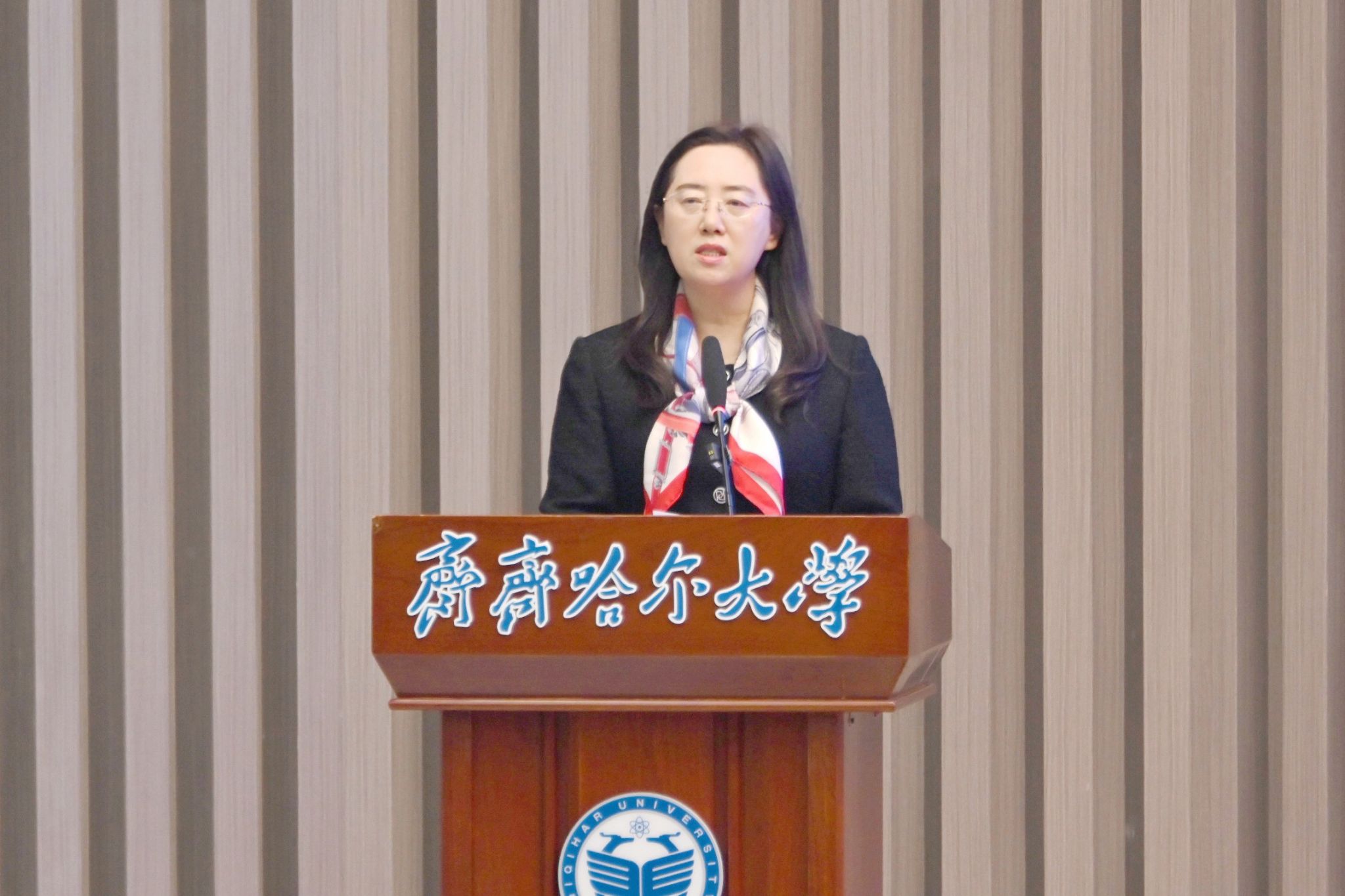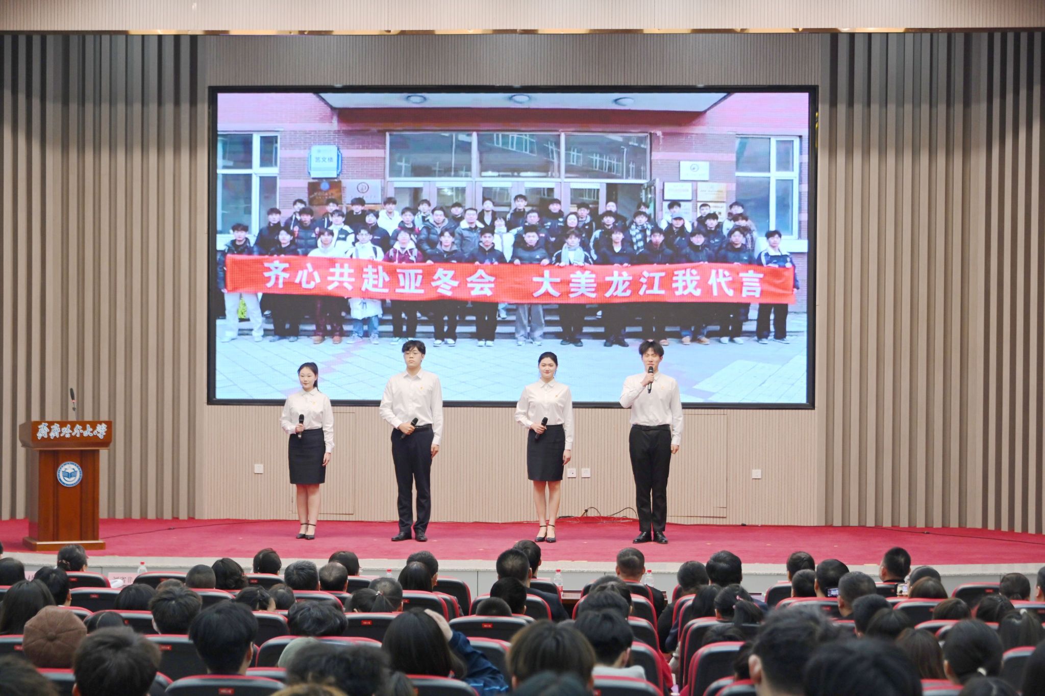学校党委书记丁宏为线上线下共同参与本次活动的全体同学讲授了思政第一课。她指出,齐大师生用行动书写的不仅是亚冬志愿服务答卷,更是新时代大学生思想政治教育的鲜活范式。要立足“大思政”场域,解码冰雪文化中的精神密码;构建“大思政”格局,打造校地协同育人共同体;拓展“大思政”路径,汲取黑土地上的精神力量。全校团员青年要胸怀“国之大者”、植根龙江热土,将“冰晶雪魄齐大情”薪火相传,把“奉献、友爱、互助、进步”的志愿精神化为行动自觉,让青春在中国式现代化龙江实践中绽放绚丽之花!
