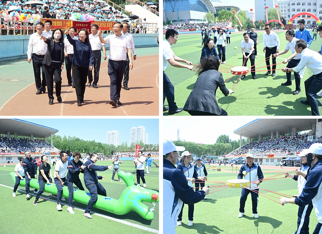 开幕式上,校工会精心组织的教职工集体趣味项目“旱地龙舟”和“同心鼓”精彩上演。教师们齐心协力,在“左右左”的口号声中驾驭彩色“龙舟”破浪前行,在鼓点与排球共舞的韵律中展现默契配合。校领导也走进赛场与教职工一同参与游戏,欢声笑语间,师者风采与团队精神相得益彰,在校领导带头参与的示范下,书写了校园文化建设“上下同心” 的生动篇章。