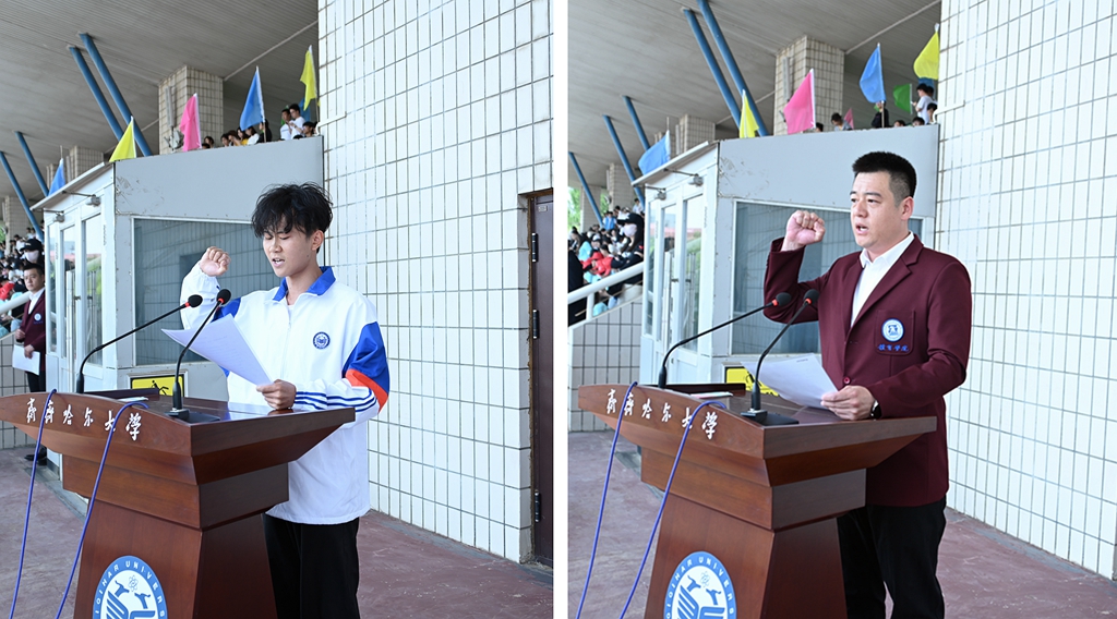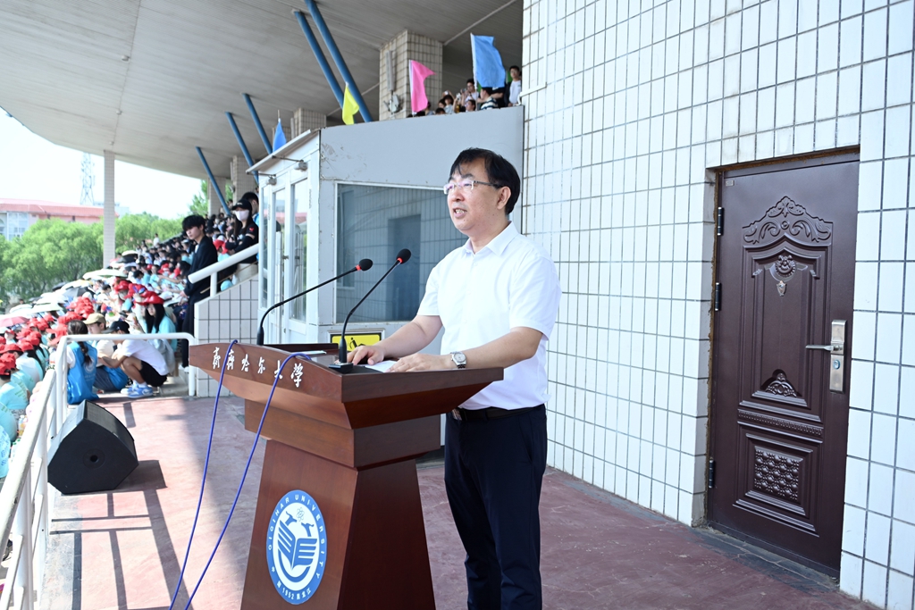 校长、党委副书记郝文斌致开幕词,他指出,学校深入贯彻习近平总书记关于体育的重要论述,全面贯彻党的教育方针,高度重视体育工作,积极开展丰富活动提升师生身体素质与健康水平。新时代新征程,学校以加快建设体育强国为指引,坚持“健康第一”教育理念,构建“五育并举”育人体系,善用科技赋能体育,助力师生在体育运动中享受乐趣、增强体质、锤炼意志,追求卓越竞技精神。希望全校师生将“顽强拼搏、超越自我”的体育精神融入日常,在实现个人梦想与民族复兴的同频共振中,书写属于新时代齐大人的华彩乐章!