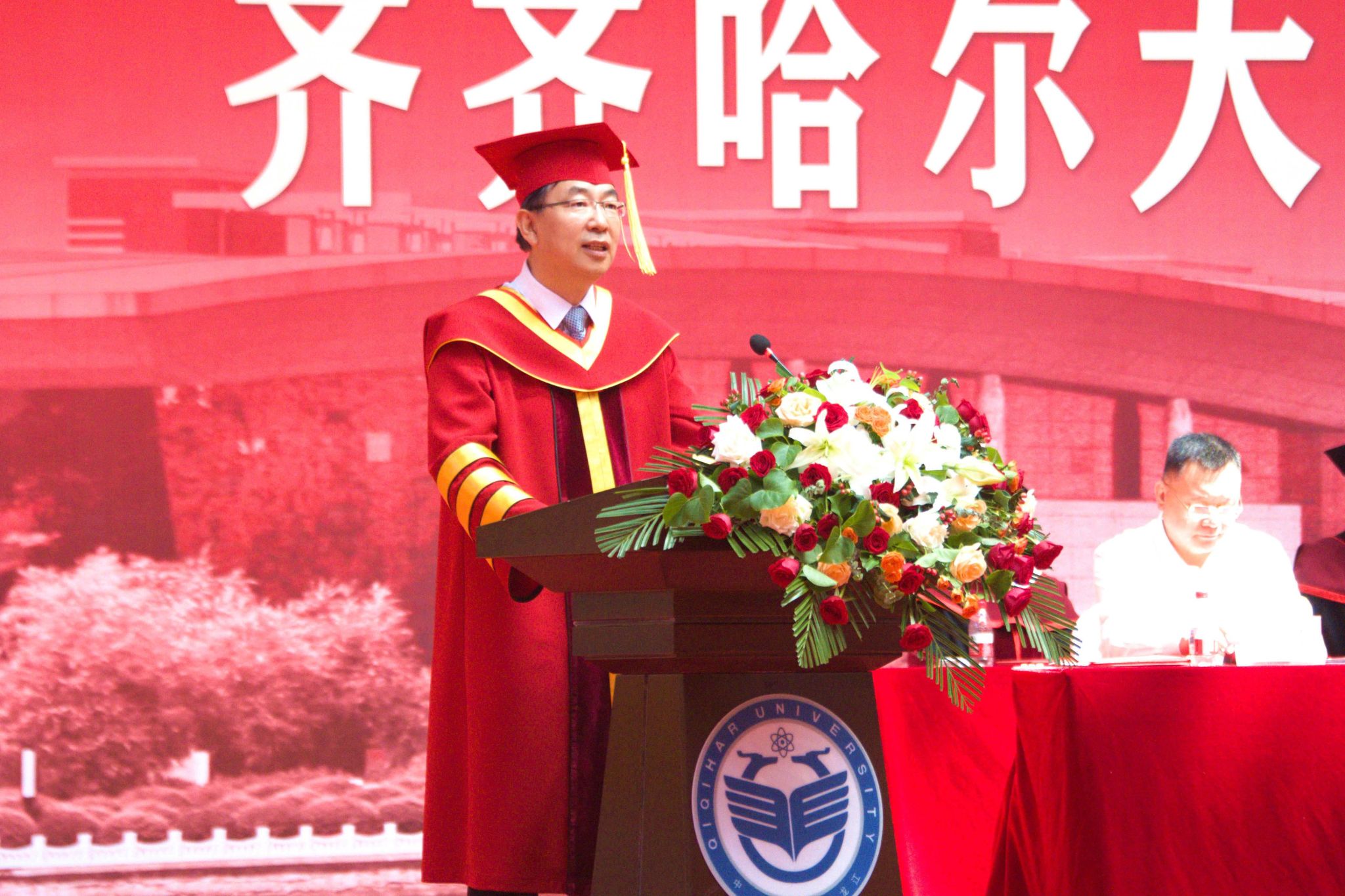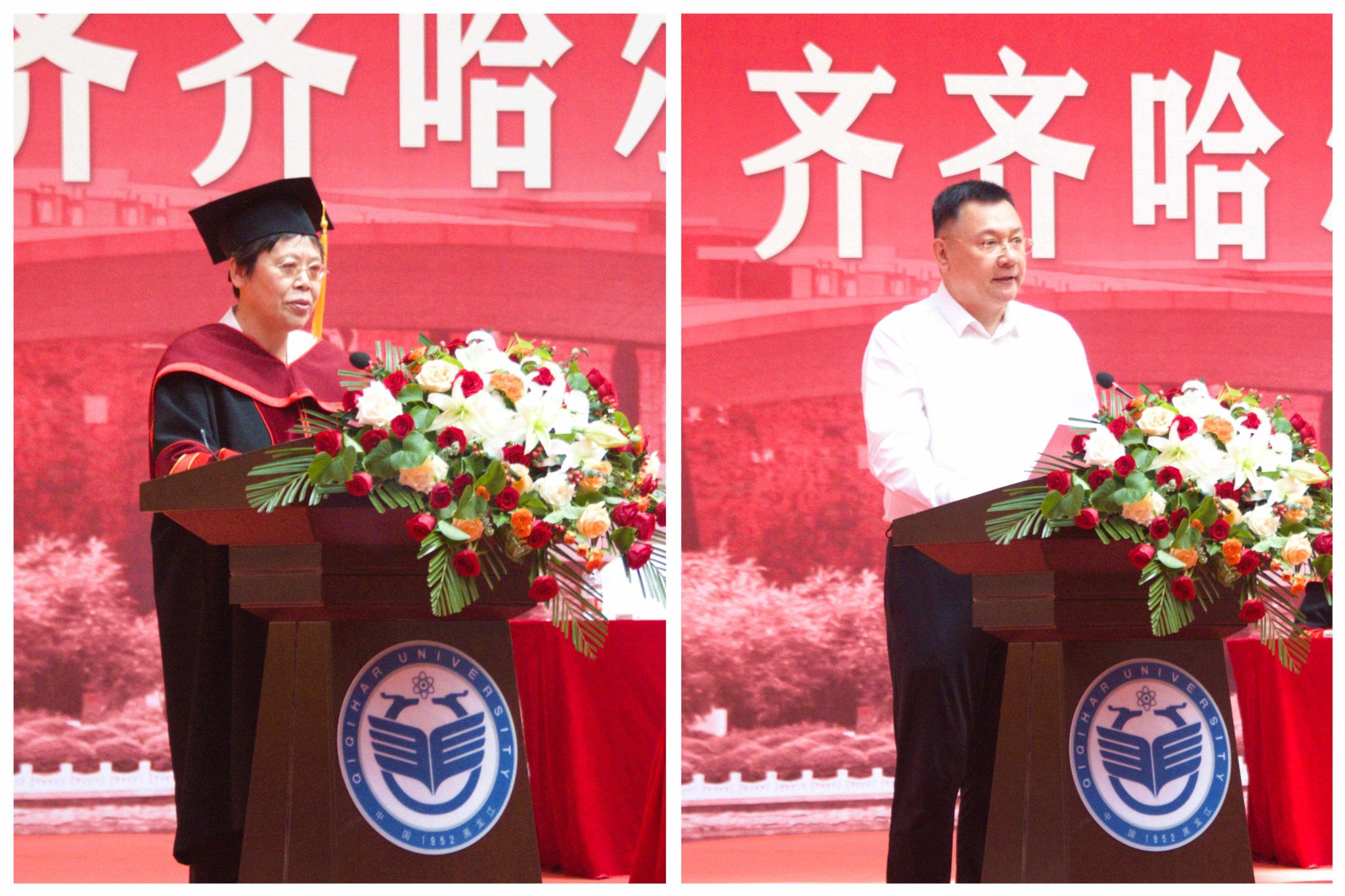 十三届全国人大代表、齐齐哈尔大学-黑龙江省果蔬杂粮饮品研发中心主任郭成宇教授代表全体教师,为同学们加油鼓劲、送上祝福。优秀校友代表、冷网供应链(山东)有限公司董事长、山东省黑龙江商会监事长、齐齐哈尔大学济南校友会会长、我校95届轻化系皮革工程专业毕业生刘雷与学弟学妹们分享了毕业30年来参加工作、个人创业的经历和感悟。