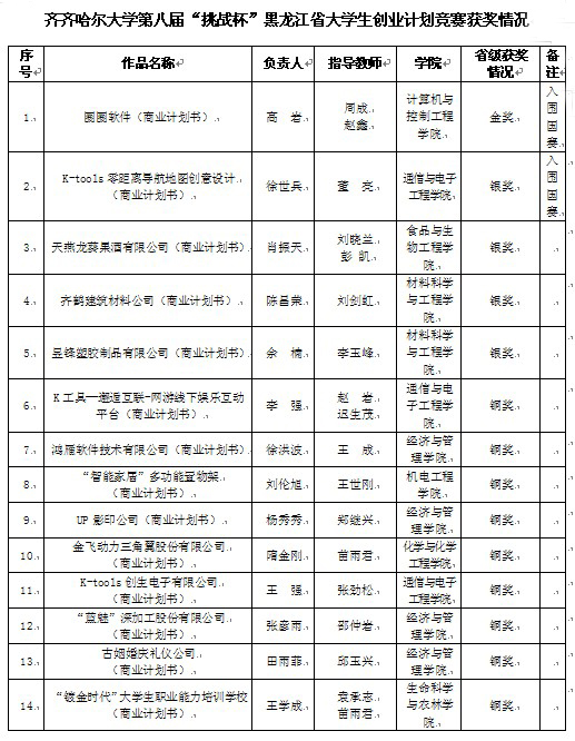 6月12日,第八届中国联通K—工具“挑战杯”黑龙江省大学生创业计划竞赛在哈尔滨工程大学启航活动中心隆重举行。我校共有14项作品入围,6项作品参与公开答辩。1项作品获金奖,4项作品获银奖,9项作品获铜奖;2项作品将代表我省参加全国竞赛,学校荣获省级优秀组织奖,位列全省高校第二位。