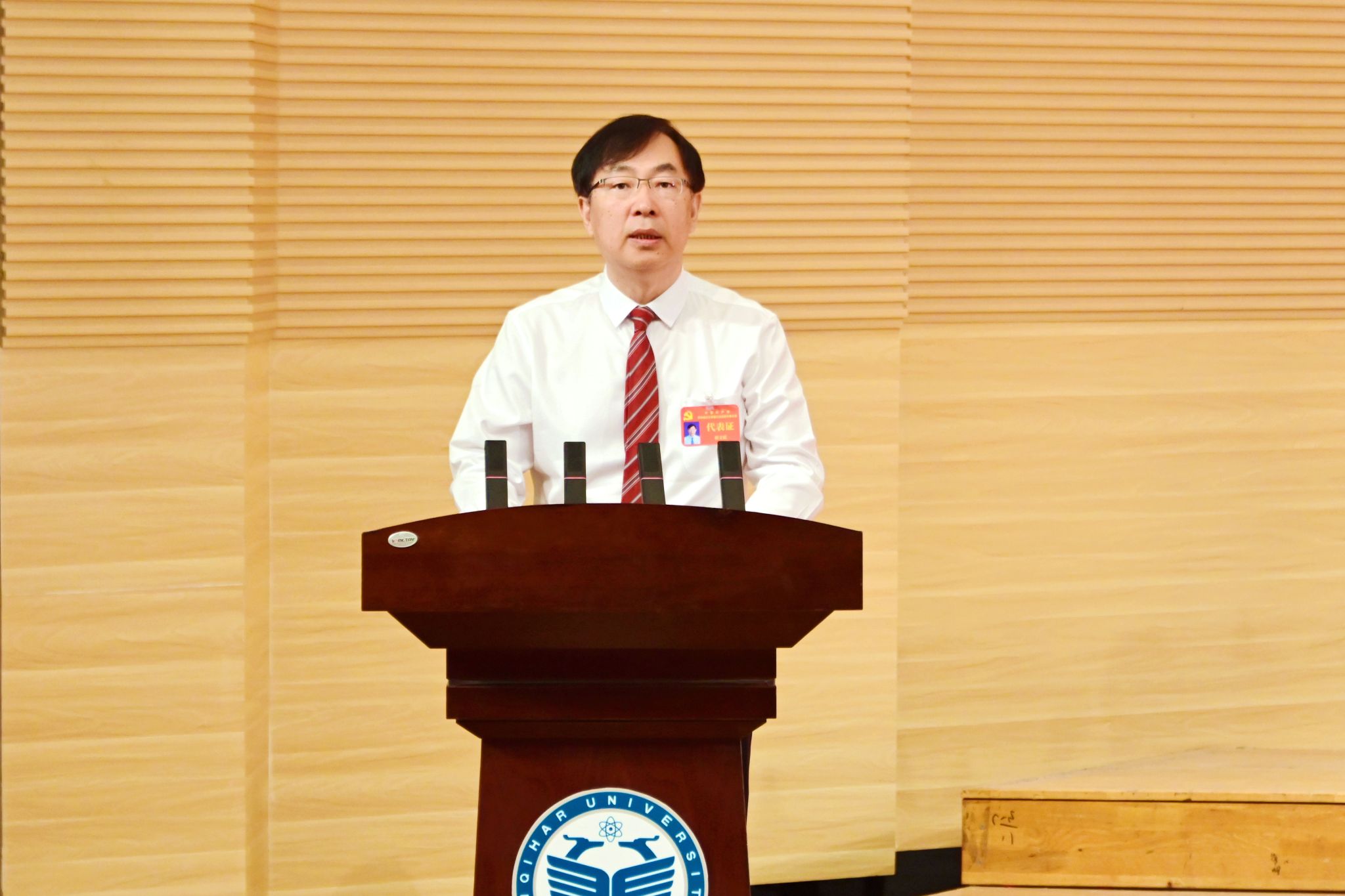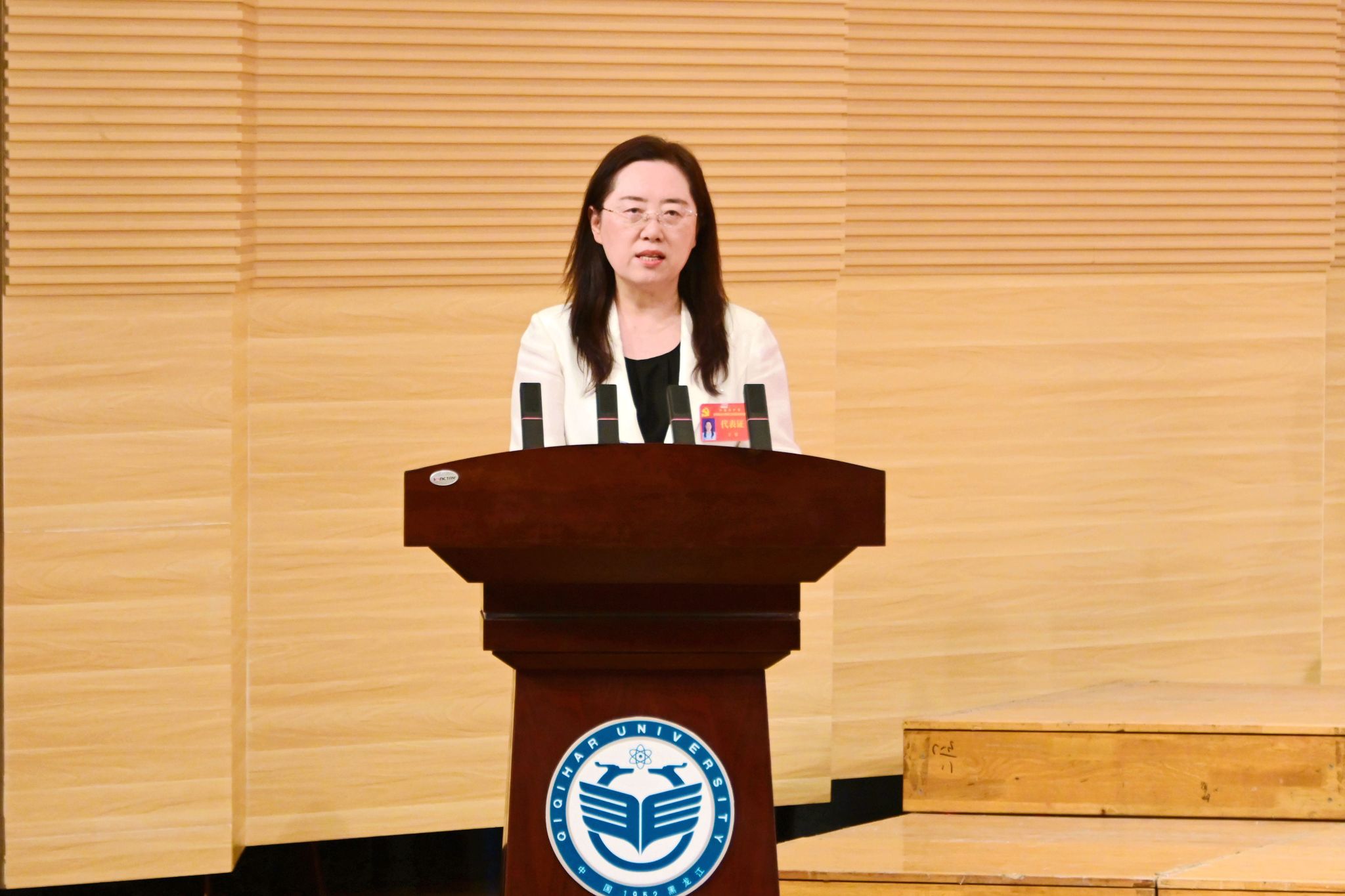 丁宏同志代表中国共产党齐齐哈尔大学第二届委员会作了题为《锚定新目标启航新征程为建设国内一流应用型综合性大学而奋斗》的工作报告。报告共分为三部分:学校第二次党代会以来的工作回顾;认清形势,明确目标,科学谋划高质量发展新蓝图;高举旗帜,勇担使命,奋力开创学校党的建设新局面。