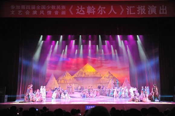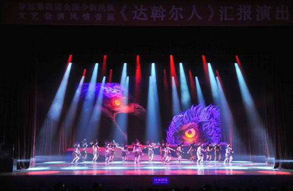 晚7点30分,风情音画《达斡尔人》在达斡尔族老爸吟唱“乌钦”的悠扬曲调中拉开了帷幕。整部作品分上篇“英勇的达斡尔”和下篇“勤劳的达斡尔”两部分。上部由民族的图腾——雄鹰开始,分别向广大观众讲述了达斡尔民族抗击外敌侵略、被迫迁徙、兴建家园、民族祈福的厚重历史。下部由生命的图腾——摇篮开始,全景展现达斡尔人的农、牧、渔、猎等生活场景,歌颂了达斡尔人浓郁的生活和幸福情感。