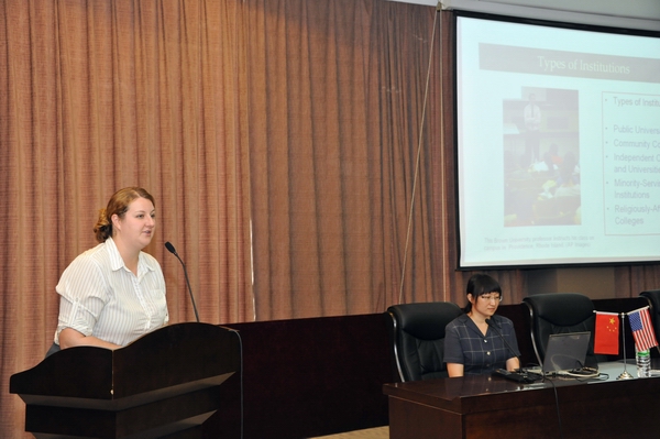 会谈结束后,美国驻沈阳总领事馆副文化领事吴剑向我校图书馆赠送了图书。美国驻沈阳总领事馆Danielle Rossi女士、信息中心助理肖白为我校学生做了美国高等教育情况专题讲座。
