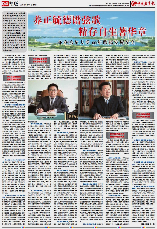 六十载养正毓德桃李芬芳,新纪元精存自生再铸辉煌。2012年5月14日,《中国教育报》第4版用整版篇幅,以图文并茂的彩色专版形式全面翔实、重点突出地报道了我校60年跨越发展实绩。文章分别从“甲子砥砺发展路 自强行健流金曲”(历史沿革)、“六秩耕耘春华诗 经时济世求实歌”(办学实绩)、“奕奕桃李菁华芳 巍巍学府弦歌亮”(校友风采)和“正学日新绘锦绣 创先争优展宏图”(蓝图展望)等四个层面彰显了齐齐哈尔大学“质量立校、人才强校、特色兴校、文化铸校”的发展理念,弘扬了以“养正毓德精存自生”校训为核心的大学精神。