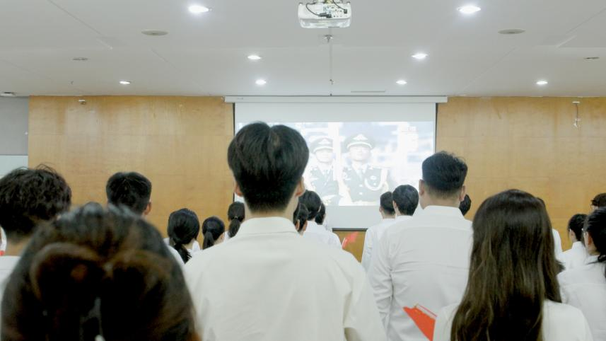 阅兵正式开始时,嘹亮的国歌声通过屏幕传来,全体师生庄严肃立,与现场同频,齐声高唱,雄壮的旋律在校园的每一个角落回荡。