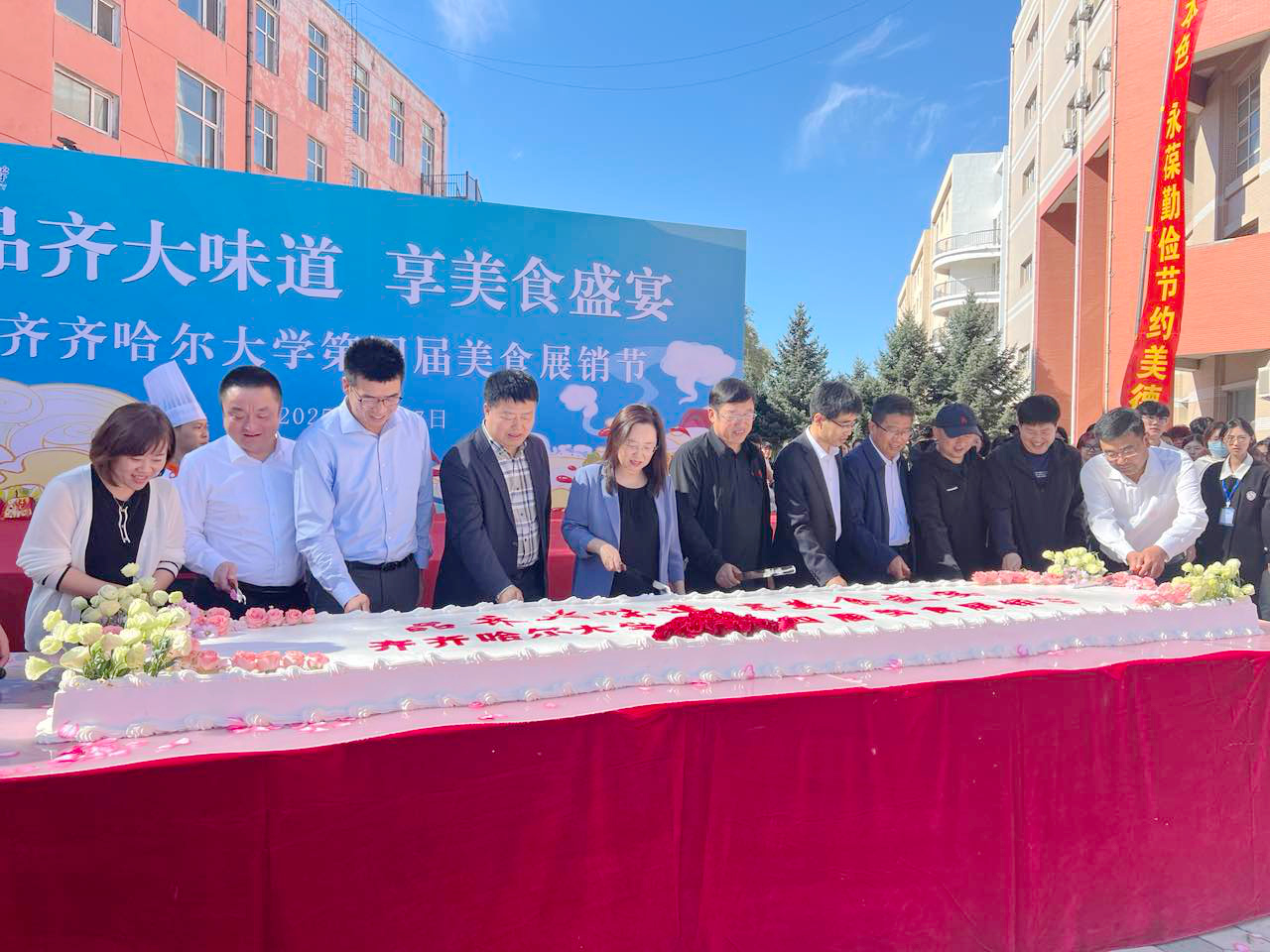 校党委书记丁宏宣布第四届校园美食展销节活动启动,校领导与嘉宾共同为师生分发蛋糕,送上美好祝福。