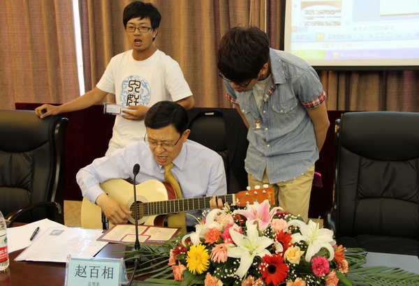 演讲期间,赵百相总领事亲手弹奏吉他伴奏,还邀请韩国留学生及中国学生上台一同演唱《I believe》及《朋友》。