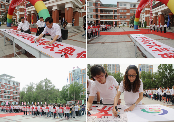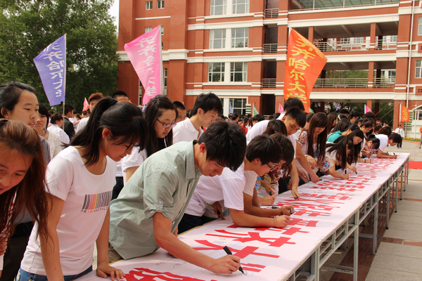 最后,参与旗帜接力活动的全体师生在“齐齐哈尔大学建校60周年庆典倒计时100天校庆联络员和志愿者‘薪火相传·爱在齐大’旗帜接力活动”横幅上签名留念。