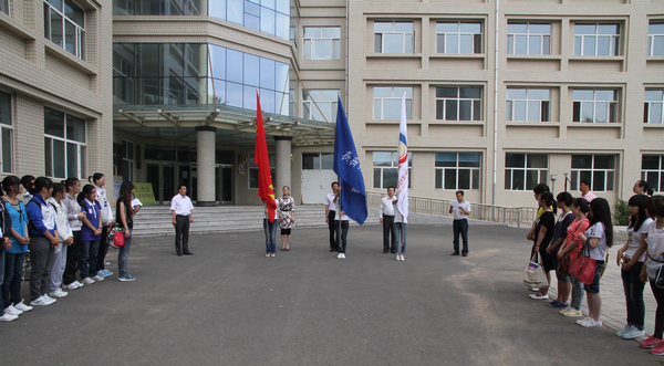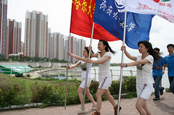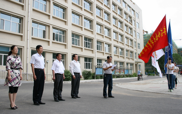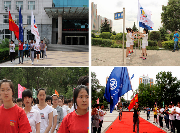 机关党委书记孟宪国、学生工作(部)处(部)处长黄伟中、校团委书记李秀梅在起跑点分别为参加接力活动校庆联络员和志愿者授校旗、60周年校庆旗和齐齐哈尔大学志愿者旗帜。
