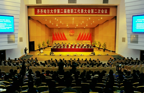 齐齐哈尔大学第二届教职工代表大会第二次会议第一次全体大会在庄严、雄壮的《国歌》声中拉开了帷幕。