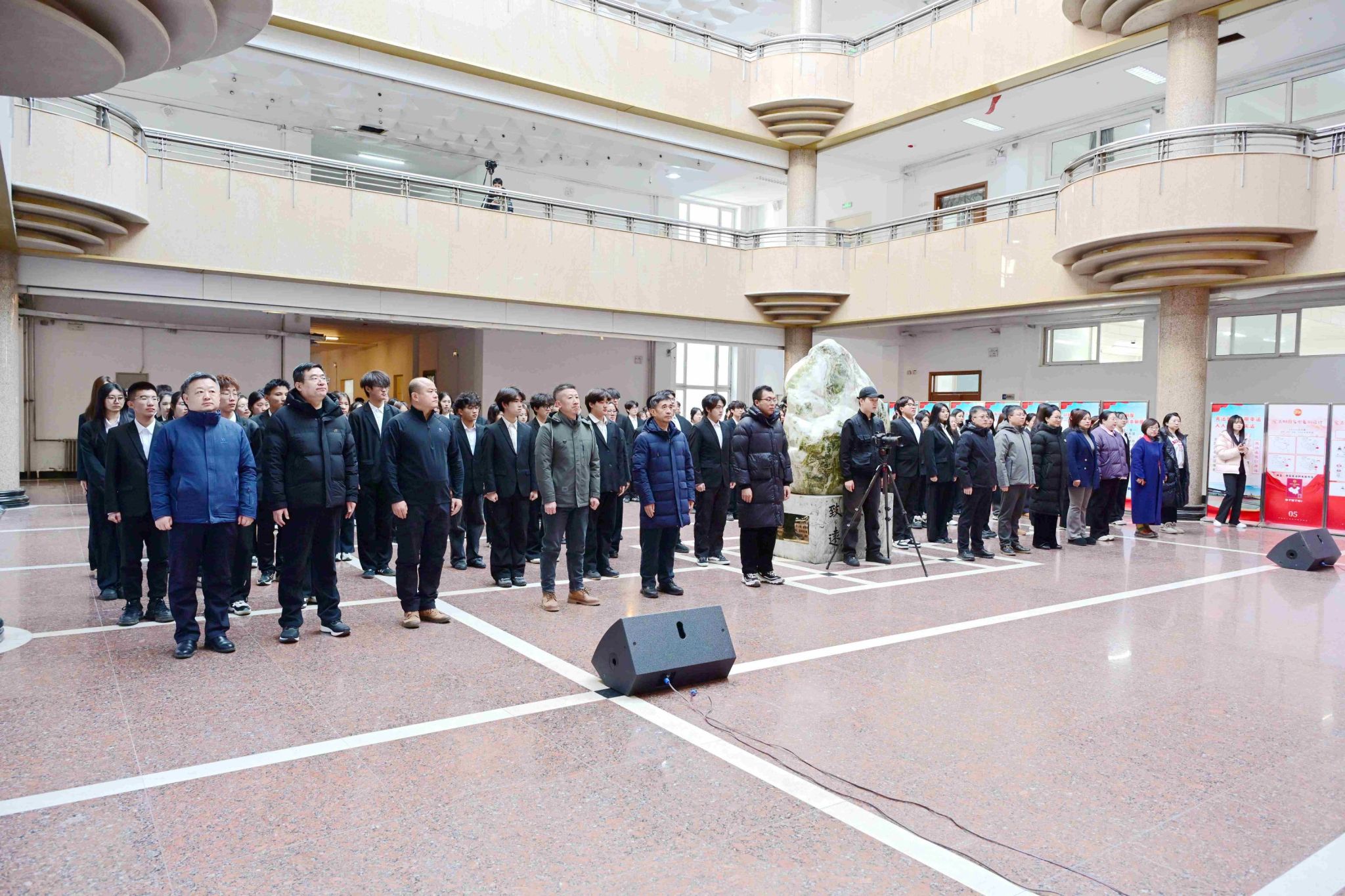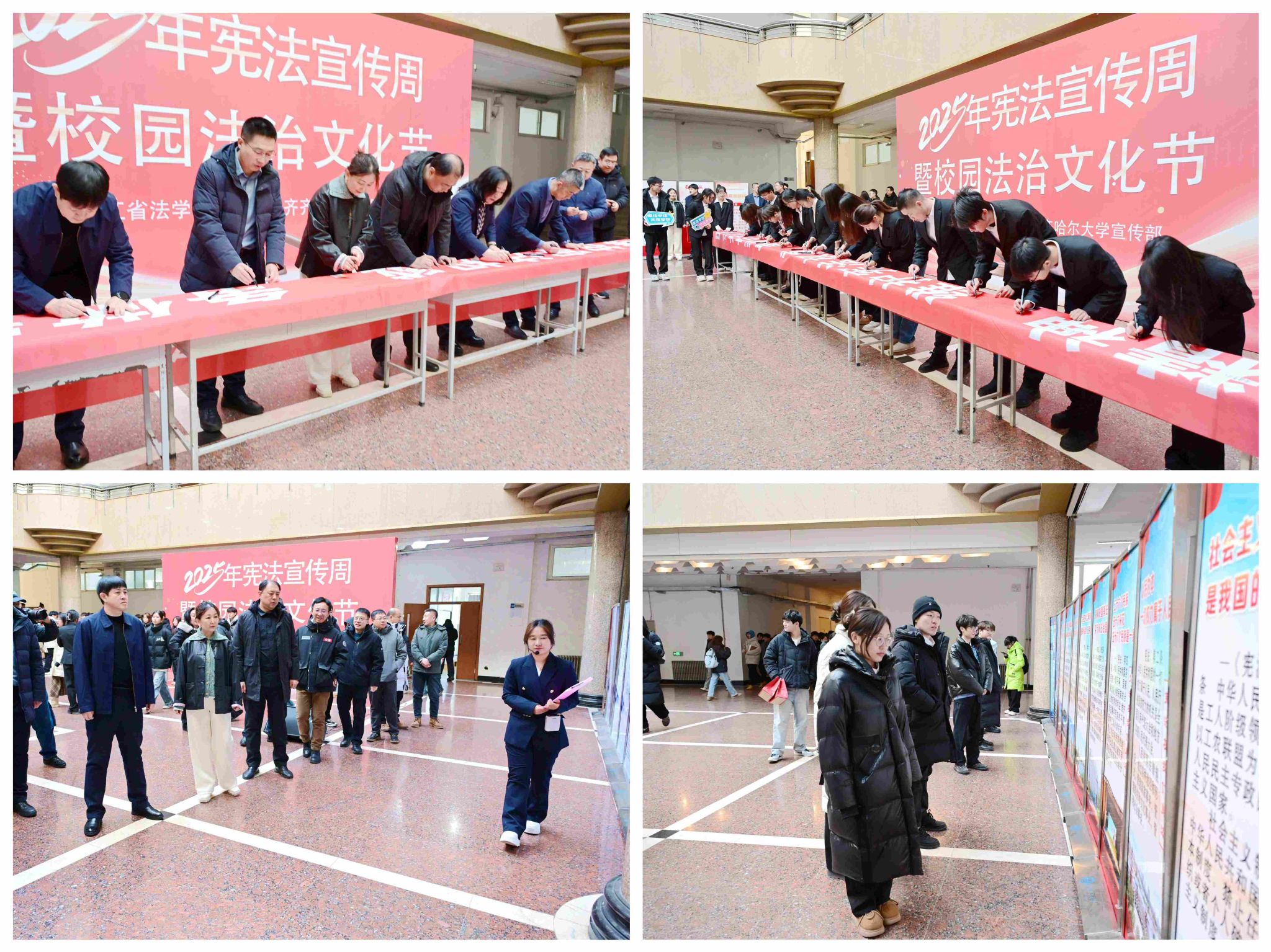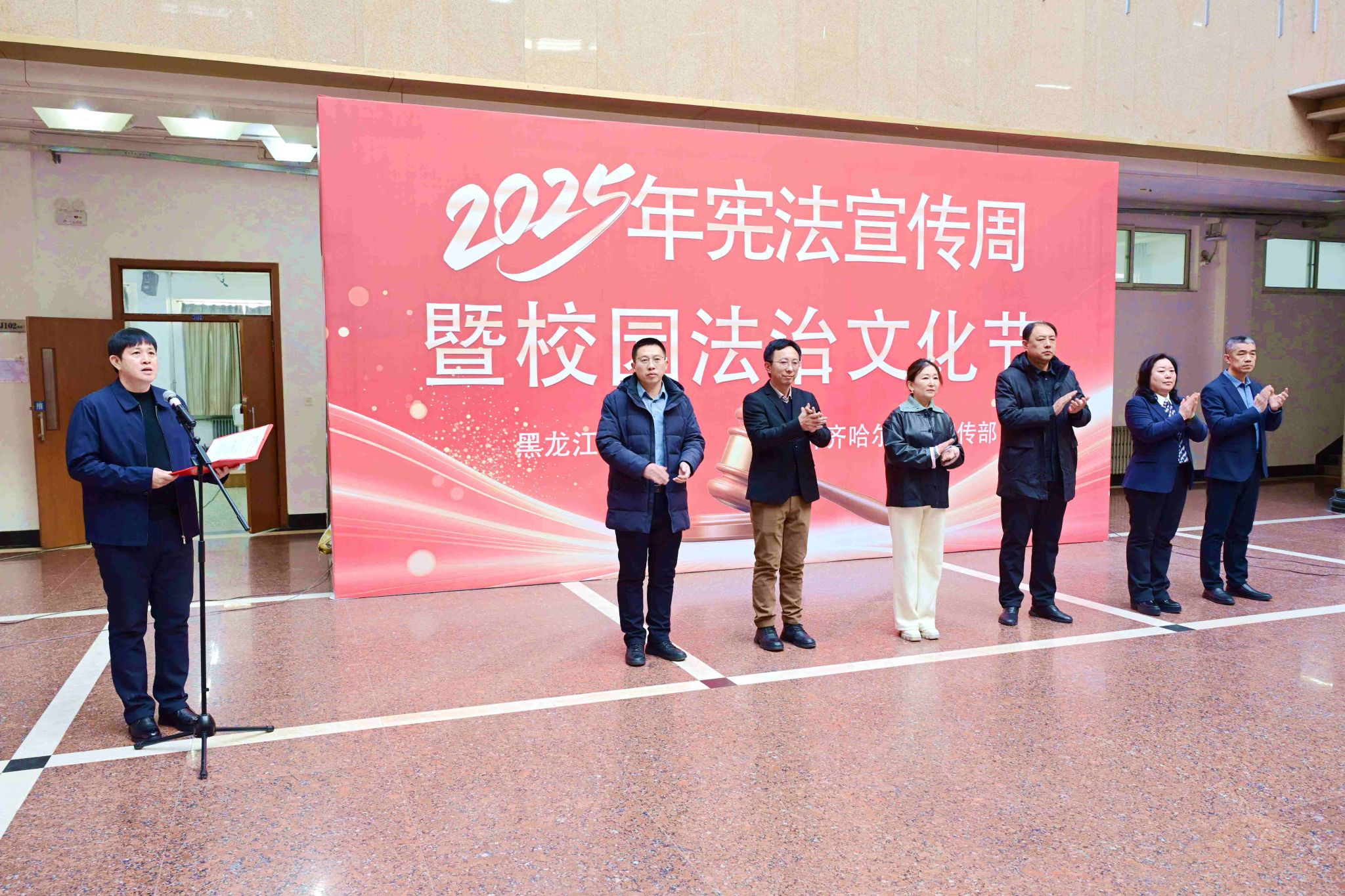 为认真贯彻党的二十大和二十届历次全会精神,深入学习宣传习近平法治思想,弘扬社会主义法治精神,大力加强宪法宣传教育,提升师生法治素养,在第十二个国家宪法日即将到来之际,12月2日中午,学校2025年“宪法宣传周”暨校园法治文化节开幕式在西区守正楼阳光大厅举行,校党委副书记、工会主席齐宏伟出席并致辞,党委常委、宣传部部长杜海权主持,相关职能部门负责人、师生代表百余人参加。