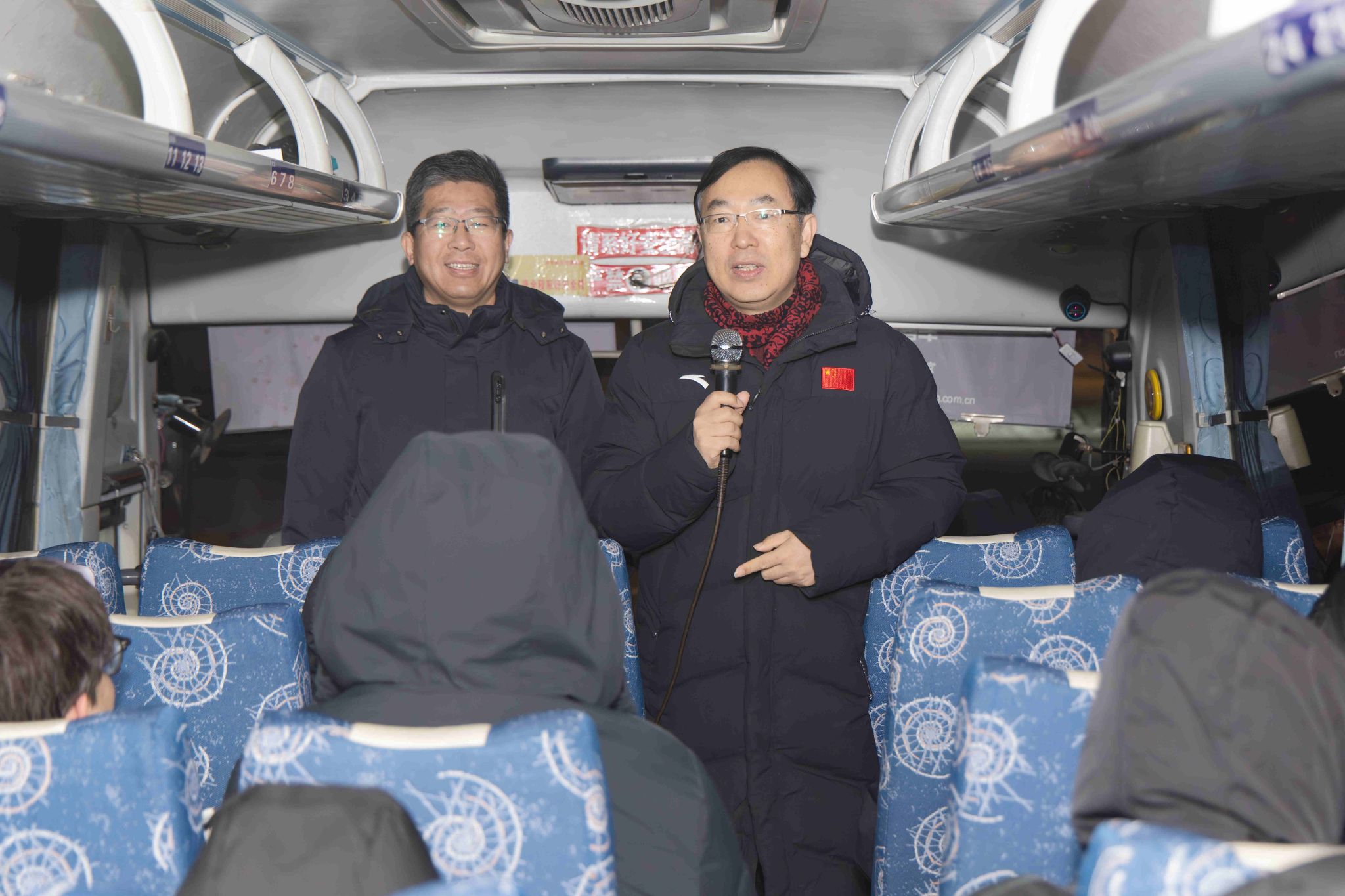 清晨六点半,天色未明,寒风凛冽,一辆辆承载暖意和爱意的大巴车整齐排列,等待着将考研学子安全送达考点。校领导们早早来到各集合点,走上大巴车送上温馨祝福,与考生们亲切交流,叮嘱大家放松心态、沉着应考,并亲手为考生送上寓意“甜蜜顺利”的糖果礼包,一句句真挚的祝福、一份份贴心的礼物,传递着学校对学子们如家人般的牵挂与支持。